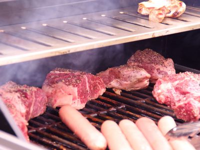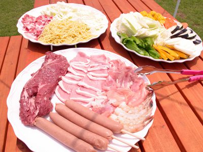| 一人前/豚肉150g・鶏肉100g・フランクフルト1本・エビ1匹・焼きそば・季節の野菜・ワンドリンク付 | 一人前/牛肉ブロック150g・豚肉100g・鶏肉70g・フランクフルト1本・エビ1匹・焼きそば・季節の野菜・ワンドリンク付 |
